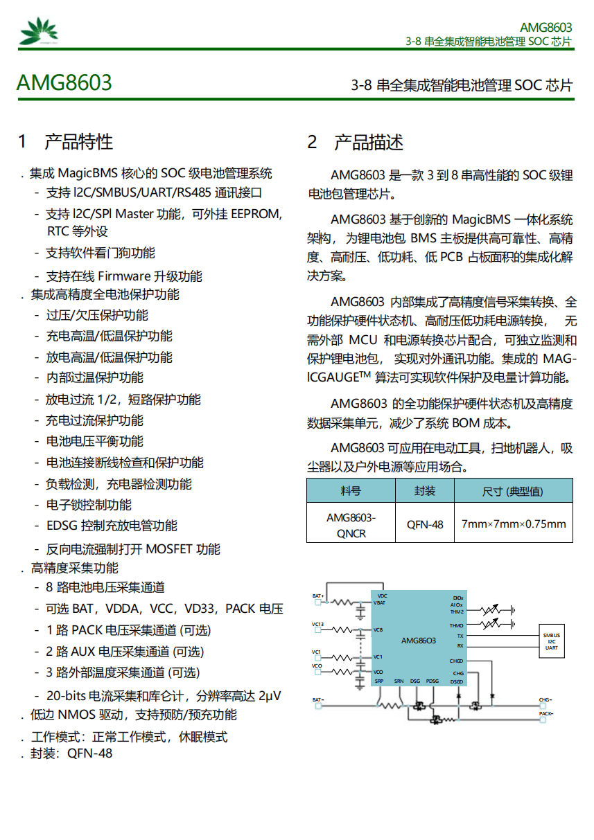 AMG8603 采用 QFN48 封装,适用于电动工具、扫地机器人、无人机、吸尘器及园林工具等锂电池供电场景中。