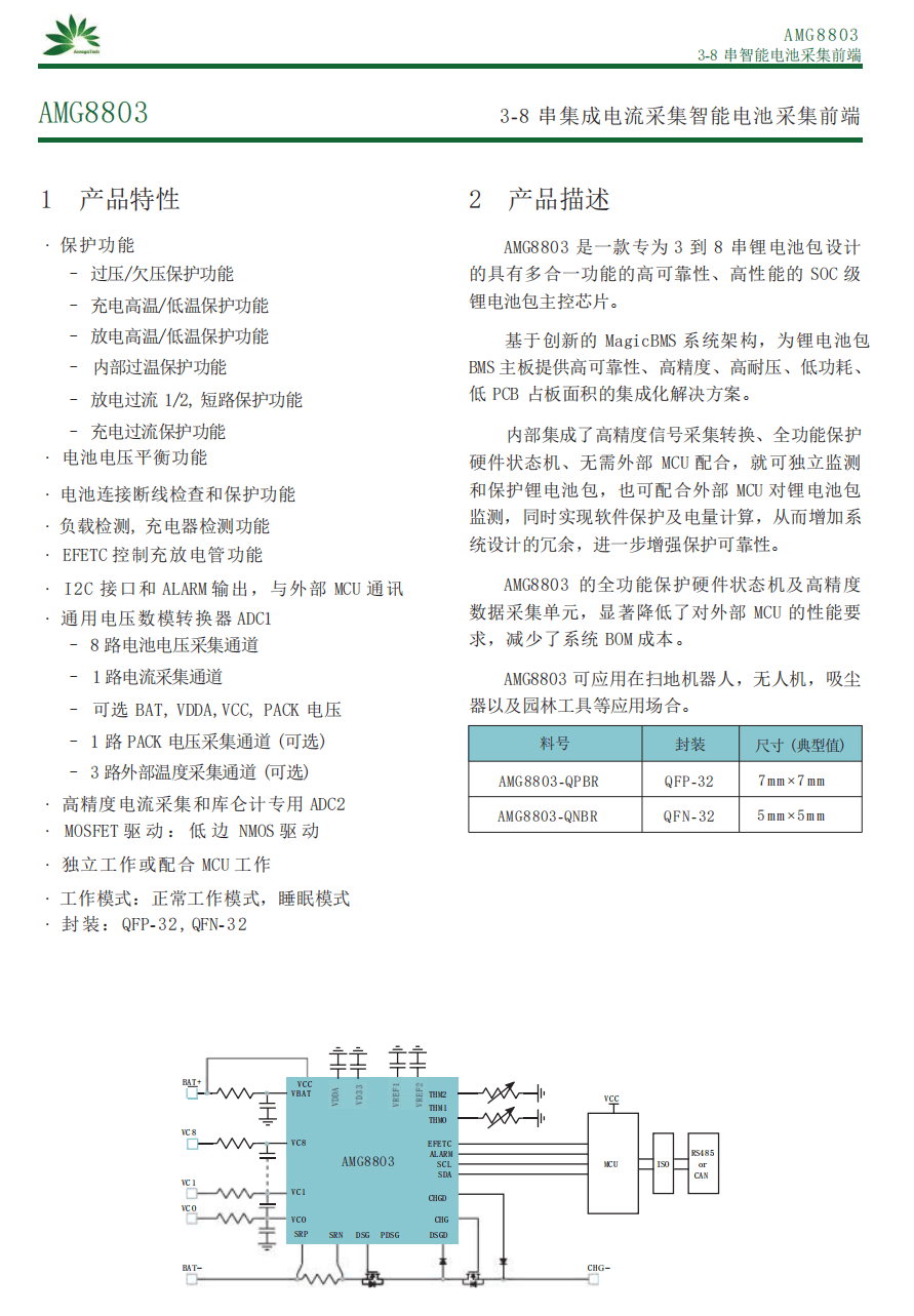 AMG8803 支持 QFP32与 QFN32双封装,可应用于扫地机器人、无人机、吸尘器及园林工具等锂电场景之中。