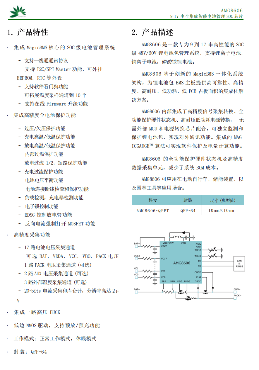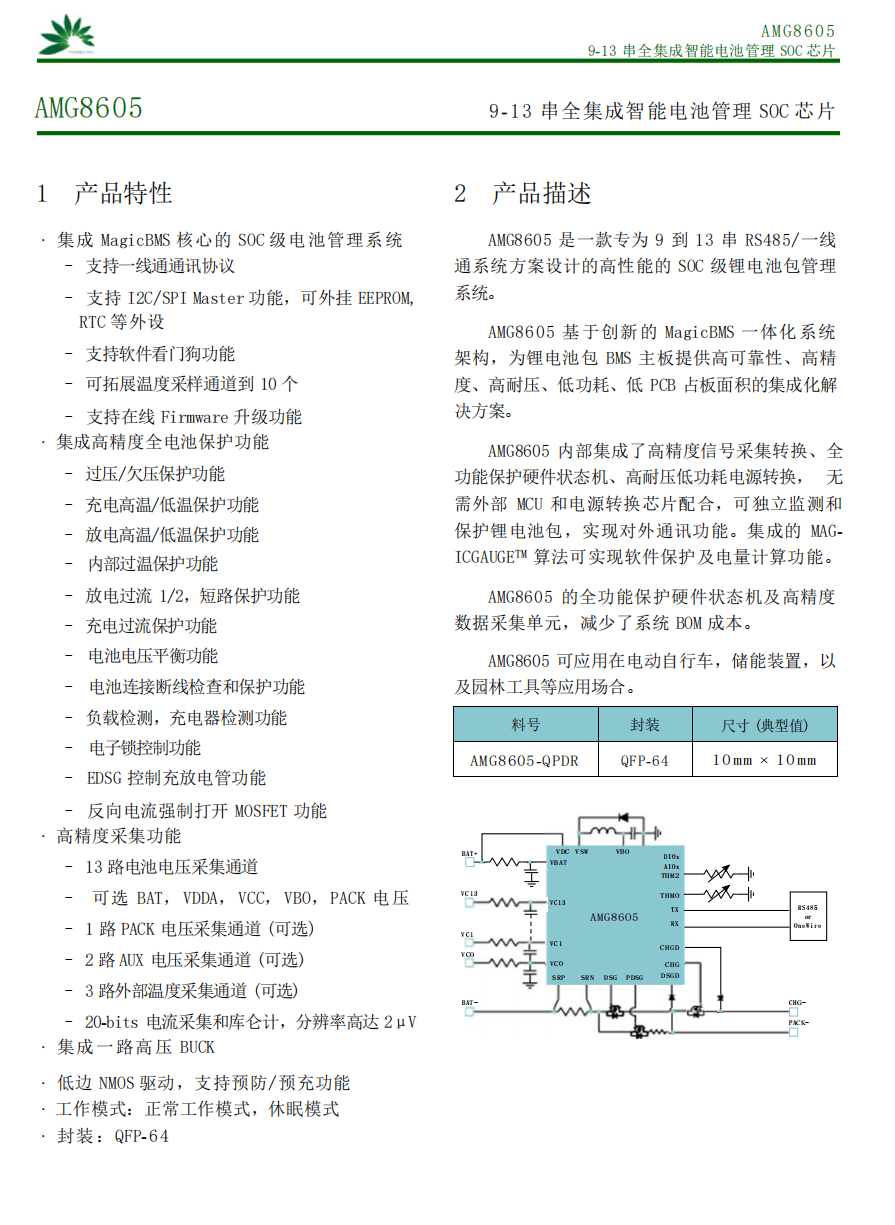 AMG8605 采用 QFP-64 封装,适用于电动自行车、储能装置、园林工具等场景,以高集成度降低系统 BOM 成本。