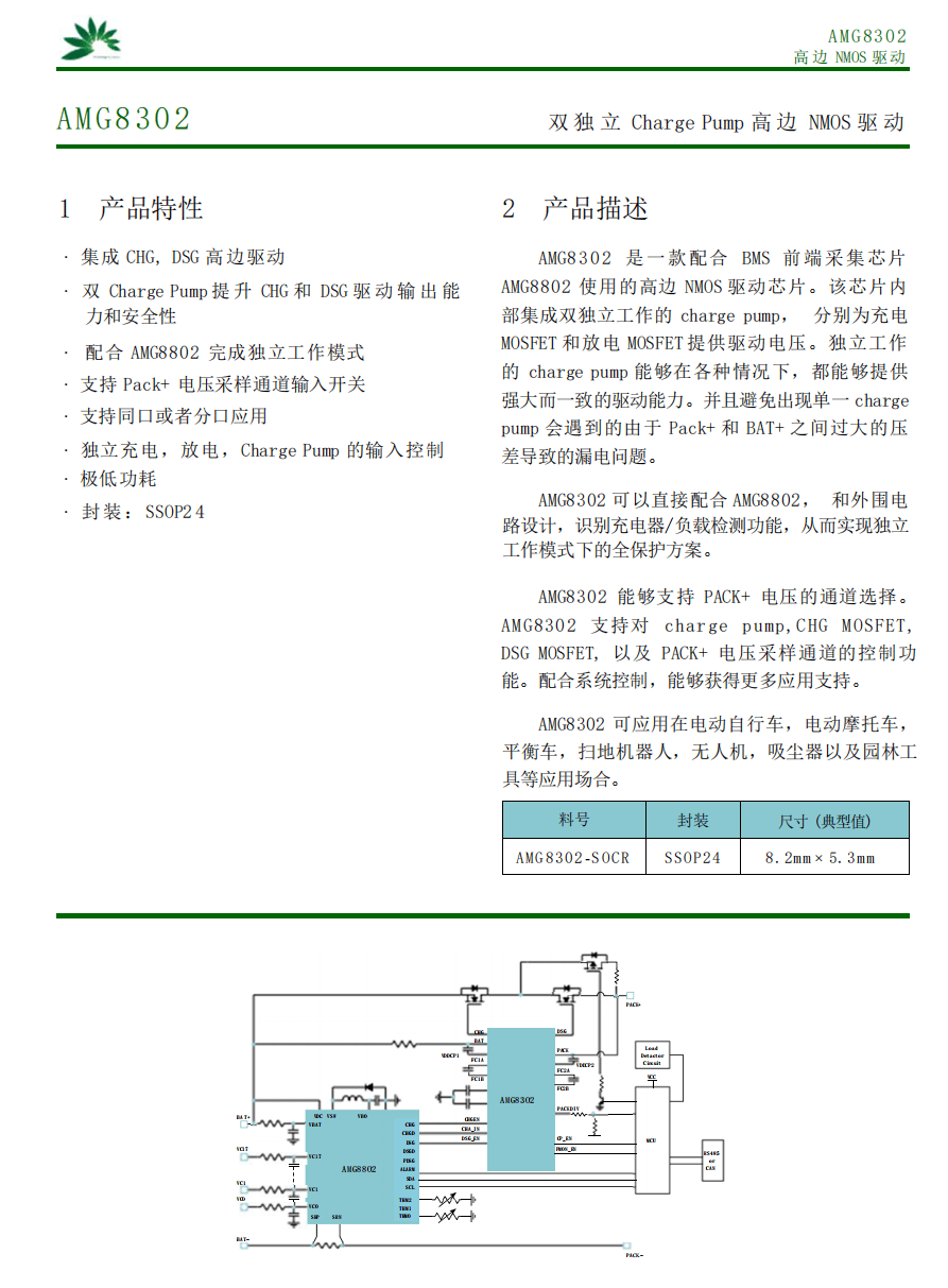 AMG8302 是一款专为 BMS 设计的高边 NMOS 驱动芯片,集成双独立电荷泵架构,可分别为充电(CHG)和放电(DSG)MOSFET 提供驱动电压,通过独立工作的电荷泵设计,既提升驱动能力,又避免单一电荷泵方案中 Pack + 与 BAT + 间压差导致的漏电问题,保障系统安全性与可靠性;同时支持 Pack + 电压采样通道及充放电独立控制,可配合 AMG 系列 AFE 前端芯片,实现独立工作模式下的全保护方案 。