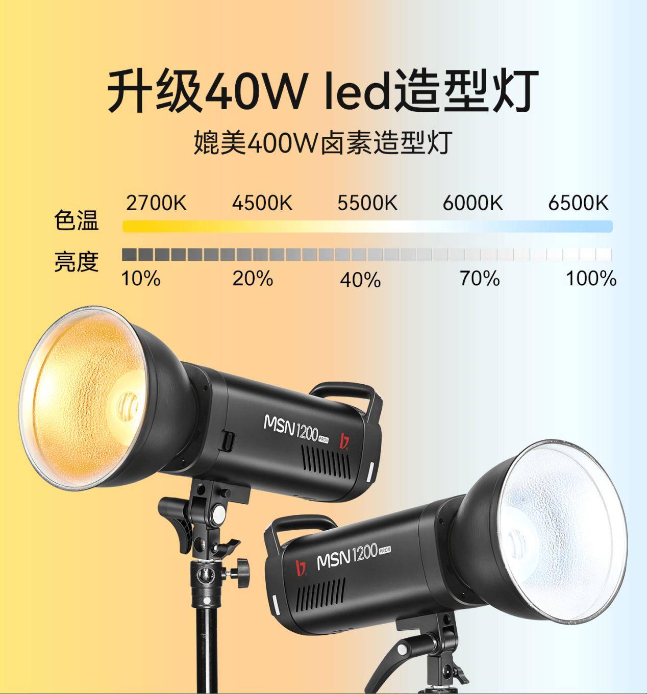 另外,MSN PRO II系列高速闪光灯还配备了40W的双色温(2700K-6500K)造型灯,支持1%-100%亮度调节,方便摄影师在正式闪光前预构图和观察光影效果。此外,还可以当作常亮灯使用,造型灯显色指数Ra>97可以还原场景的真实感,拍摄现场花絮也可以少布置一盏灯节省空间。