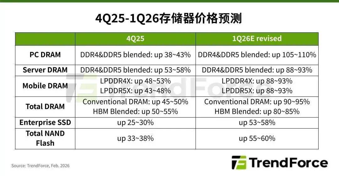 根据TrendForce集邦咨询最新存储器产业调查,2026年第一季AI与数据中心需求持续加剧全球存储器供需失衡,原厂议价能力有增无减,TrendForce集邦咨询据此全面上修第一季DRAM、NAND Flash各产品价格季成长幅度,预估整体Conventional DRAM合约价将从一月初公布的季增55-60%,调整为上涨90-95%,NAND Flash合约价则从季增33-38%上调至55-60%,并且不排除仍有进一步上修空间。