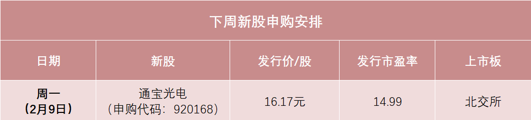 根据目前的发行安排,下周只有1只新股申购,即周一(2月9日)的北交所新股通宝光电。