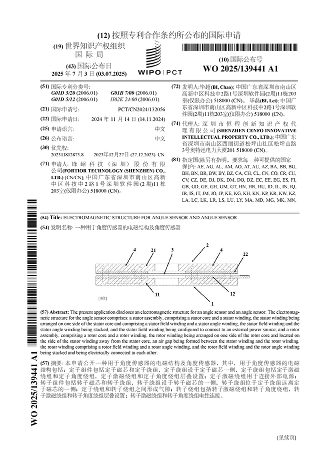 证券之星消息,根据企查查数据显示峰岹科技(688279)公布了一项国际专利申请,专利名为“一种用于角度传感器的电磁结构及角度传感器”,专利申请号为PCT/CN2024/132056,国际公布日为2025年7月3日。
