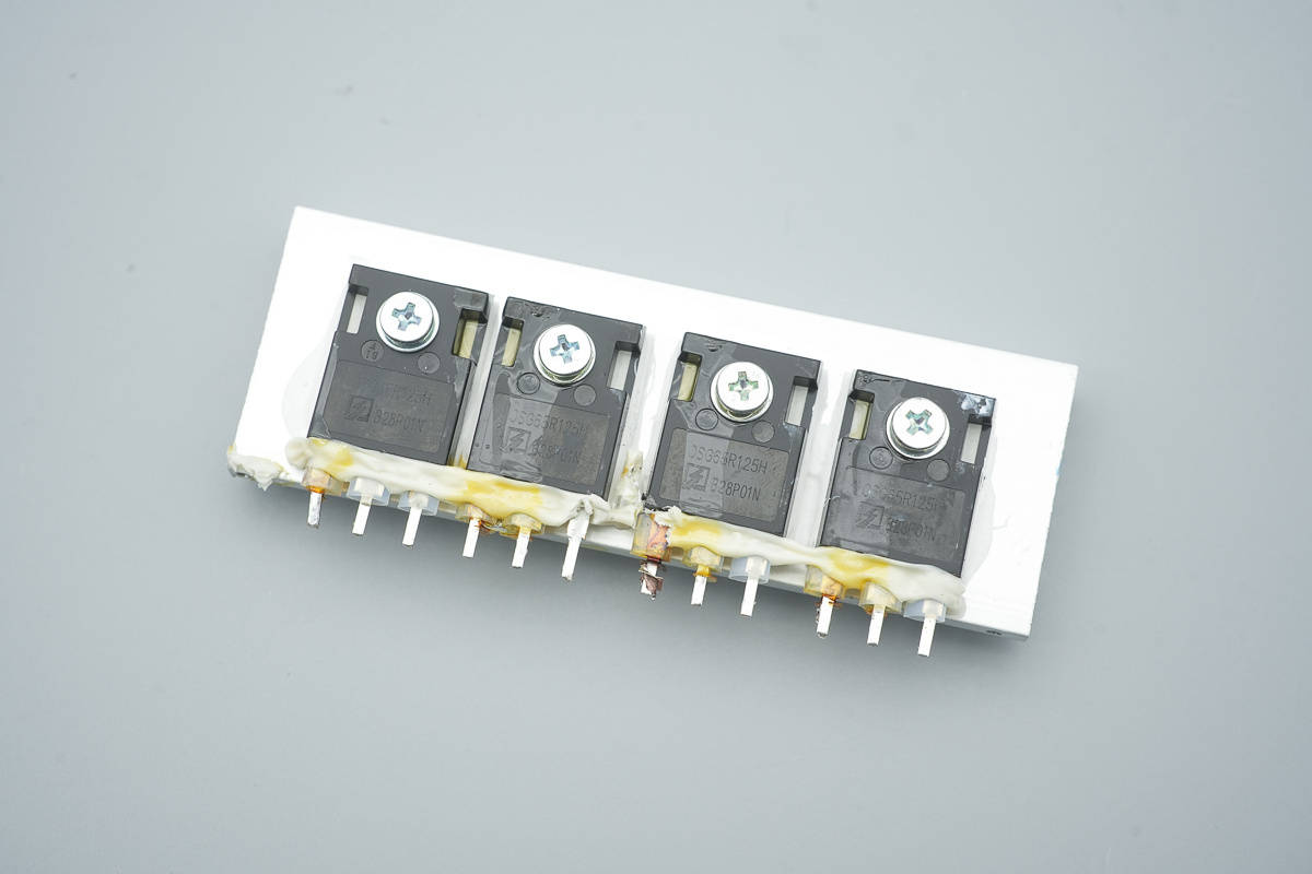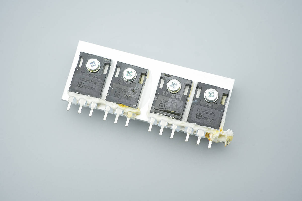 PFC开关管来自东微半导体,型号OSG65R125HF,NMOS,耐压700V,导阻125mΩ,采用TO247封装,引脚套塑料管绝缘,并打胶固定。