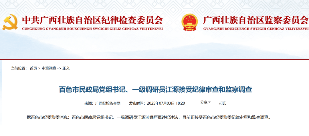 据百色市纪委监委消息:百色市民政局党组书记、一级调研员江源涉嫌严重违纪违法,目前正接受百色市纪委监委纪律审查和监察调查。