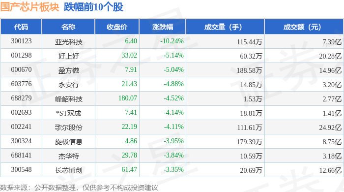 证券之星消息,7月7日国产芯片板块较上一交易日下跌0.41%,亚光科技领跌。当日上证指数报收于3473.13,上涨0.02%。深证成指报收于10435.51,下跌0.7%。国产芯片板块个股涨跌见下表: