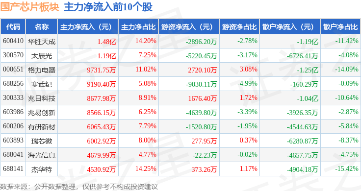 从资金流向上来看,当日国产芯片板块主力资金净流出32.98亿元,游资资金净流入4.73亿元,散户资金净流入28.24亿元。国产芯片板块个股资金流向见下表: