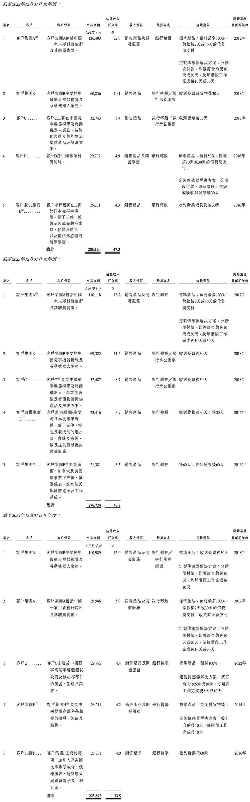 2022年、2023年、2024年,其五大客户产生的收入分别约占同期总收入的约47.3%、45.8%、33.5%。