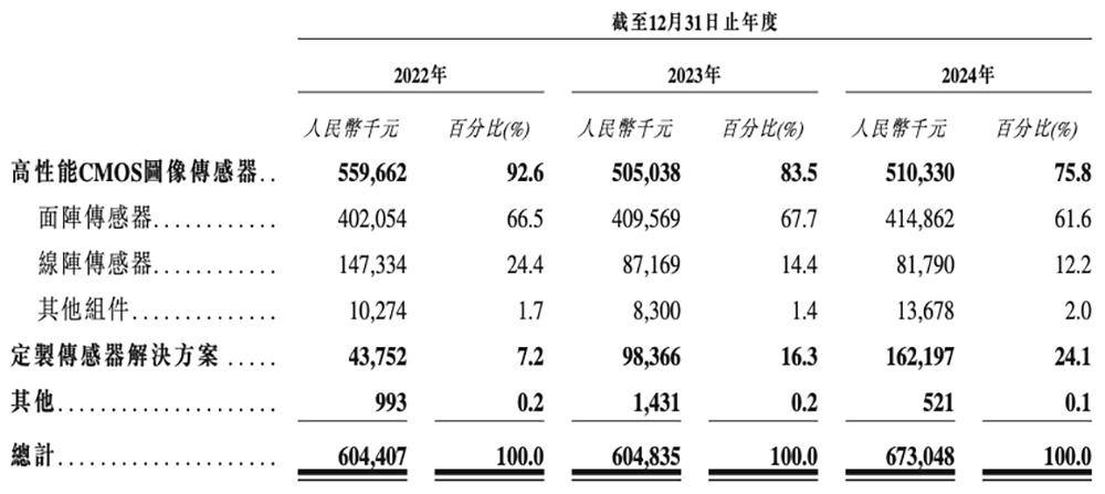 2024年,长光辰芯有61.6%的收入来自面阵传感器,有12.2%的收入来自线阵传感器,还有24.1%的收入来自定制传感器解决方案。