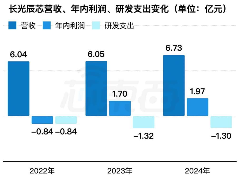 2022年、2023年、2024年,长光辰芯的收入分别为6.04亿元、6.05亿元、6.73亿元,年内利润分别为-0.84亿元、1.70亿元、1.97亿元,研发费用分别为0.84亿元、1.32亿元、1.30亿元。