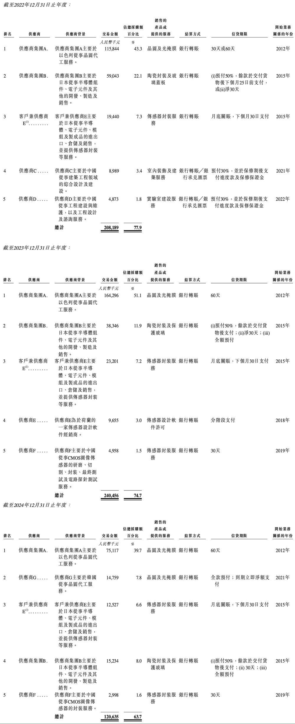 其中,供应商E也是其主要客户。长光辰芯向供应商E采购外包封装服务,并以分销模式向该实体出售其CMOS图像传感器。