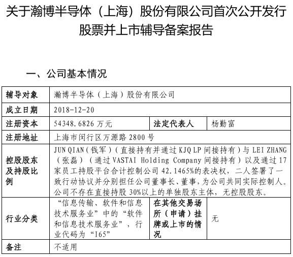 辅导备案报告提到,钱军(直接持有并通过KJQ LP间接持有)与张磊(通过VASTAI Holding Company 间接持有)以及通过17 家员工持股平台合计控制公司42.1465%的表决权,二人签署了一 致行动协议并分别担任公司董事长、董事,为公司共同实际控制人。 公司不存在直接持股30%以上的单独股东主体,无控股股东。