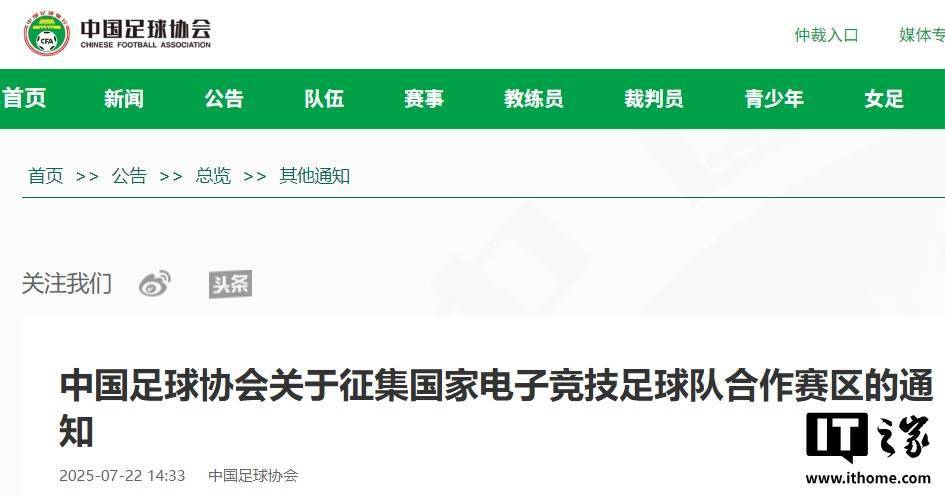 IT 之家 7 月 22 日消息,中国足协网站今日发布《关于征集国家电子竞技足球队合作赛区的通知》。
