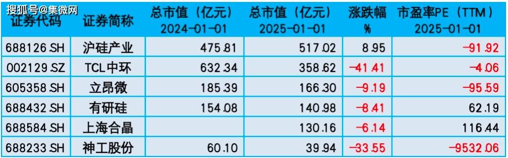 从个股来看,2024年末,市值最高的是沪硅产业(517.02亿元),排列前三的还有TCL中环(358.62亿元)、立昂微(166.30亿元)。