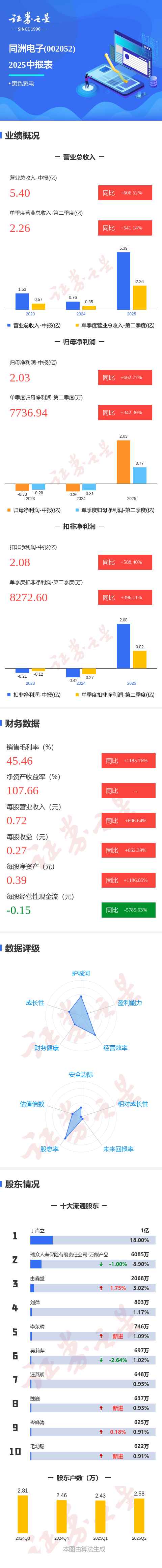 证券之星消息,同洲电子2025年中报显示,公司主营收入5.4亿元,同比上升606.52%;归母净利润2.03亿元,同比上升662.77%;扣非净利润2.08亿元,同比上升588.4%;其中2025年第二季度,公司单季度主营收入2.26亿元,同比上升541.15%;单季度归母净利润7736.94万元,同比上升342.31%;单季度扣非净利润8272.6万元,同比上升396.12%;负债率63.14%,投资收益112.37万元,财务费用1195.49万元,毛利率45.46%。