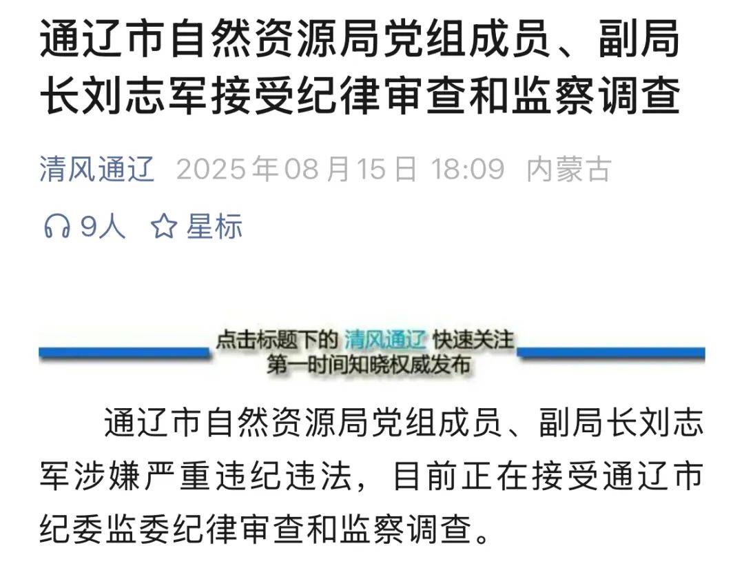 据内蒙古通辽市纪委监委消息:通辽市自然资源局党组成员、副局长刘志军涉嫌严重违纪违法,目前正在接受通辽市纪委监委纪律审查和监察调查。