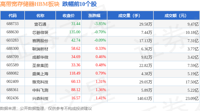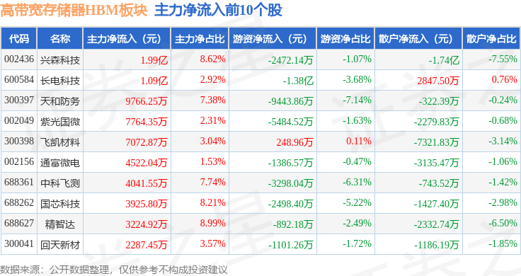 从资金流向上来看,当日高带宽存储器HBM板块主力资金净流入2.92亿元,游资资金净流出3.64亿元,散户资金净流入7230.73万元。高带宽存储器HBM板块个股资金流向见下表: