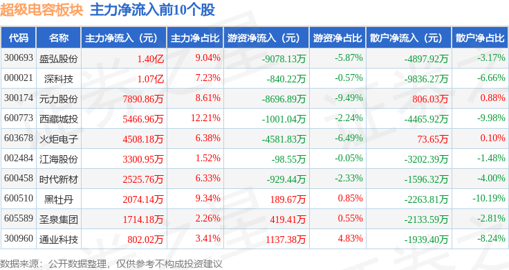 从资金流向上来看,当日超级电容板块主力资金净流出3.68亿元,游资资金净流出2.84亿元,散户资金净流入6.52亿元。超级电容板块个股资金流向见下表: