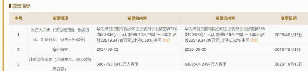 据国家信用信息公示系统显示,华为投资控股有限公司(以下简称“华为投资控股”)工商信息于8月15日发生变更,注册资本由约580.78亿元增至约638.86亿元,增加约58亿元,增幅近10%。