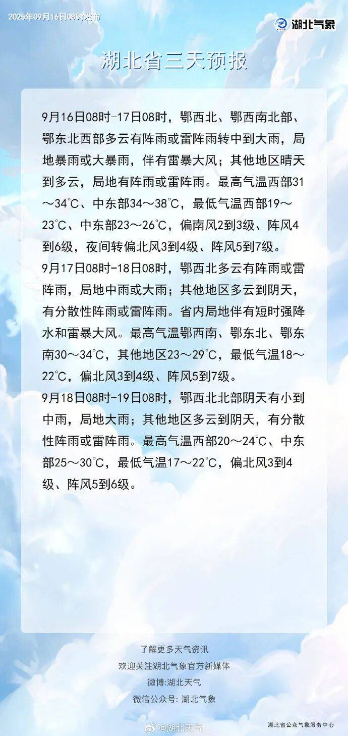 今天鄂西北局地雨势较强,公众需留意当地最新预报预警信息,外出注意安全!此外,今天中东部气温较高,局地将突破37℃,提醒公众注意防暑降温。明后天气温将逐步走低,请公众关注气温变化,及时增减衣物。