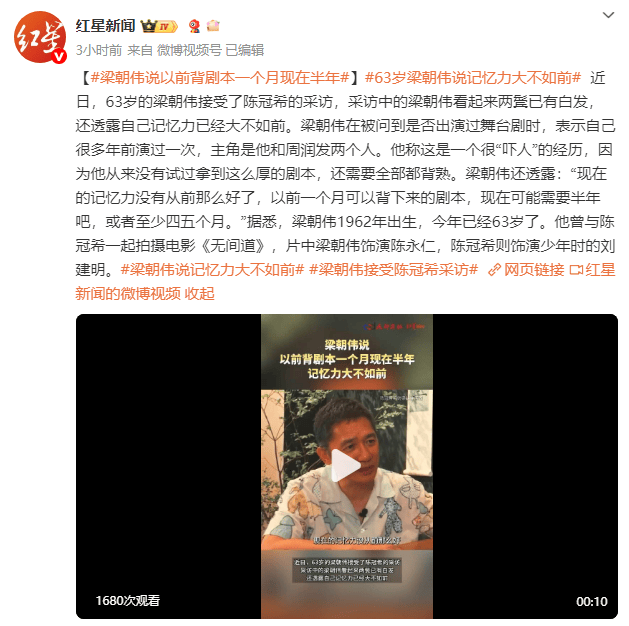 梁朝伟在被问到是否出演过舞台剧时,表示自己很多年前演过一次,主角是他和周润发两个人。他称这是一个很“吓人”的经历,因为他从来没有试过拿到这么厚的剧本,还需要全部都背熟。梁朝伟还透露:“现在的记忆力没有从前那么好了,以前一个月可以背下来的剧本,现在可能需要半年吧,或者至少四五个月。”