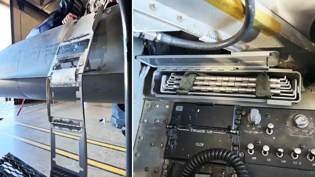 2023年左右,美国空军又测试了一种配备给F-16战斗机的内置登机梯。这种登机梯重量不到3公斤,可以折叠收纳在F-16战斗机驾驶舱内的的地图收纳盒里。使用时,只需要把这个登机梯放出来,就能让飞行员进出飞机。