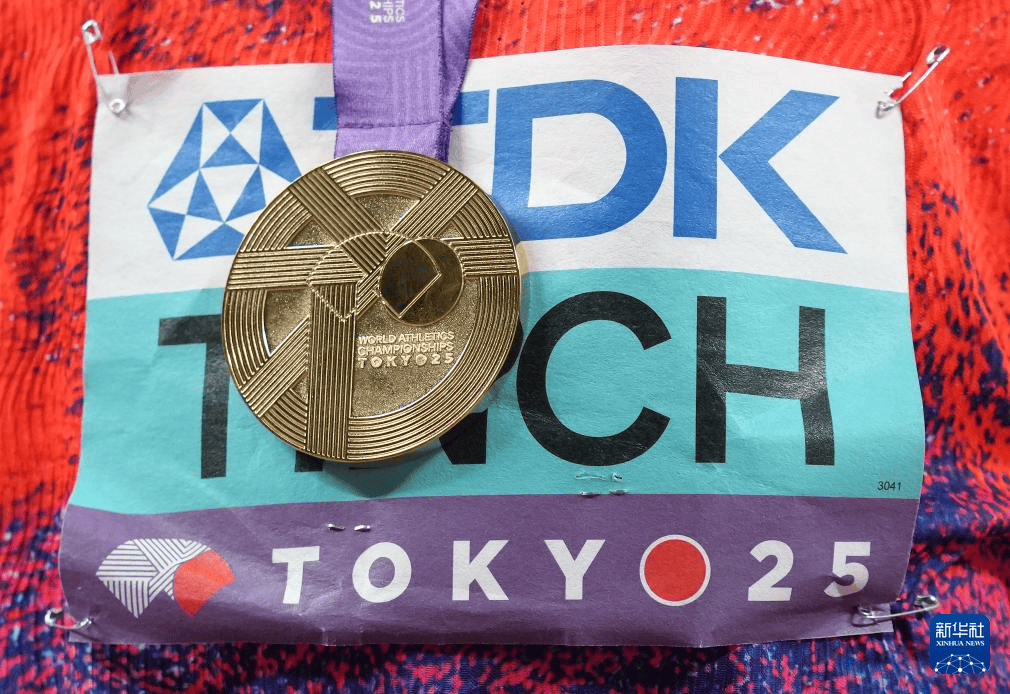 这是9月16日拍摄的冠军美国选手科德尔·廷奇的金牌。