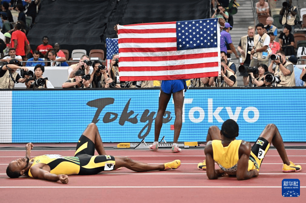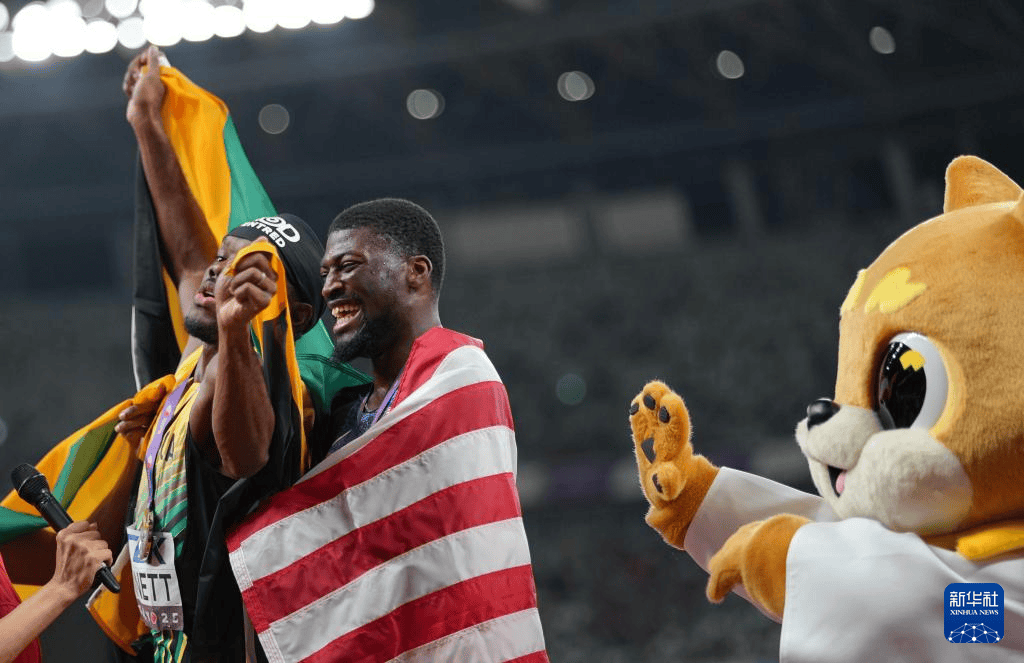 9月16日,冠军美国选手科德尔·廷奇(右)和亚军牙买加选手奥兰多·贝内特赛后庆祝。