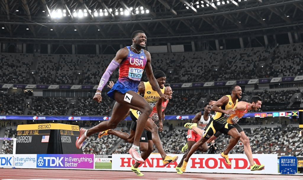 9月16日,美国选手科德尔·廷奇(右)冲线后庆祝。