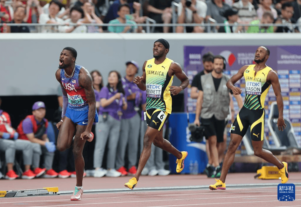 9月16日,美国选手科德尔·廷奇(左)和牙买加选手奥兰多·贝内特(中)在比赛中。