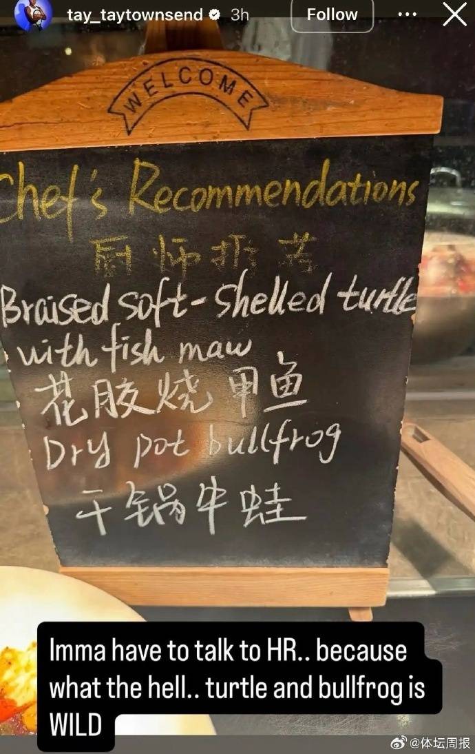 据体坛周报,9月16日,网球比利-简-金杯总决赛在深圳开打,代表美国队出战的汤森德在个人社交平台连发多条视频吐槽中国菜,对花胶烧甲鱼、干锅牛蛙等菜肴嘲讽不断,“我必须和HR谈谈……因为什么鬼……(吃)甲鱼和牛蛙也太疯狂了吧。这是我看过的最疯狂的食物,人们竟然吃这些。”