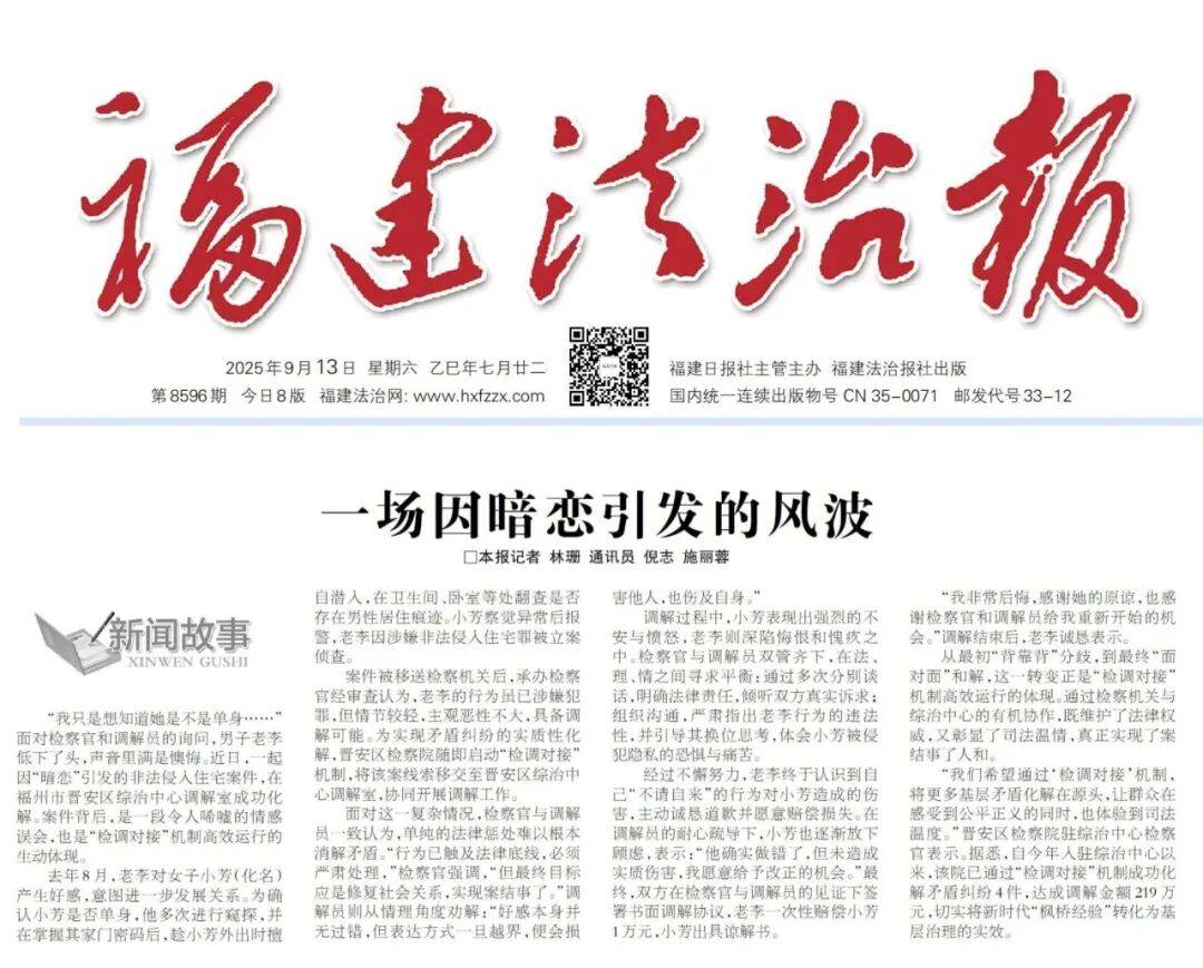 我只是想知道她是不是单身……”面对检察官和调解员的询问,男子老李低下了头,声音里满是懊悔。近日,一起因“暗恋”引发的非法侵入住宅案件,在福州市晋安区综治中心调解室成功化解。案件背后,是一段令人唏嘘的情感误会,也是“检调对接”机制高效运行的生动体现。