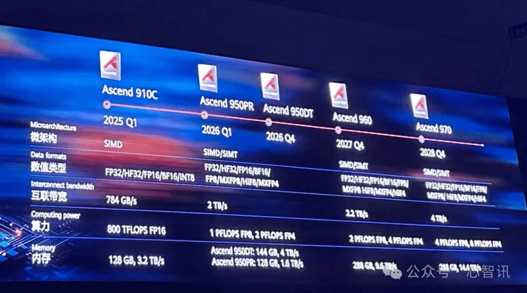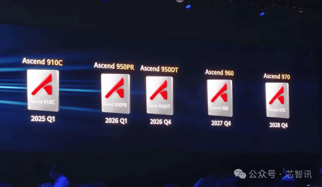 9月18日,在华为全联接大会2025上,华为轮值董事长徐直军公布了最新的昇腾AI芯片路线图。根据路线图显示,华为在今年一季度已经推出了昇腾910C。后续将在2026年第一季度推出全新的昇腾950PR芯片,四季度推出昇腾950DT。2027年四季度,华为将推出昇腾960芯片,2028年四季度推出昇腾970芯片。