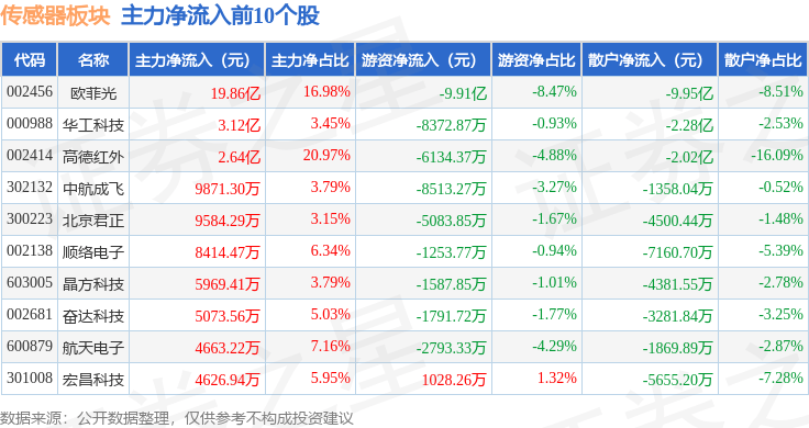 从资金流向上来看,当日传感器板块主力资金净流出15.4亿元,游资资金净流出4.53亿元,散户资金净流入19.93亿元。传感器板块个股资金流向见下表: