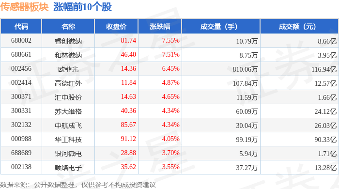 证券之星消息,9月19日传感器板块较上一交易日下跌0.25%,汉威科技领跌。当日上证指数报收于3820.09,下跌0.3%。深证成指报收于13070.86,下跌0.04%。传感器板块个股涨跌见下表: