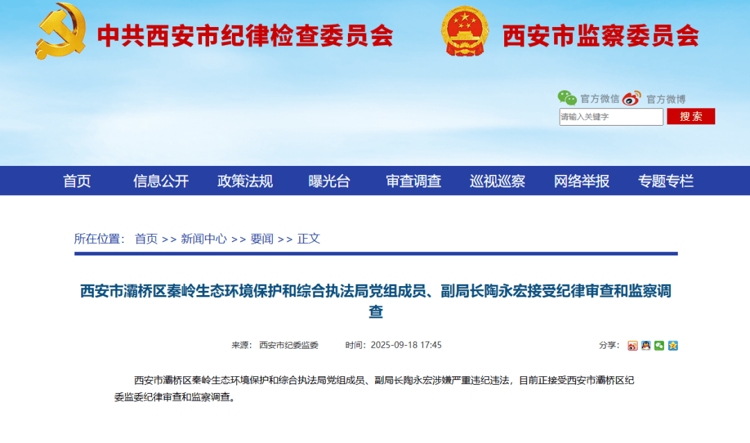 西安市灞桥区秦岭生态环境保护和综合执法局党组成员、副局长陶永宏涉嫌严重违纪违法,目前正接受西安市灞桥区纪委监委纪律审查和监察调查。