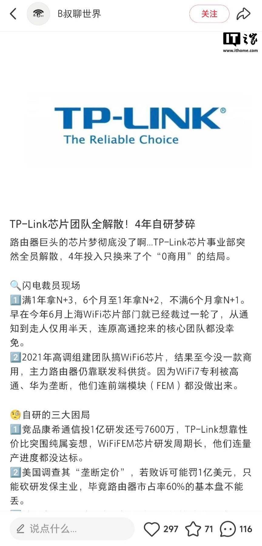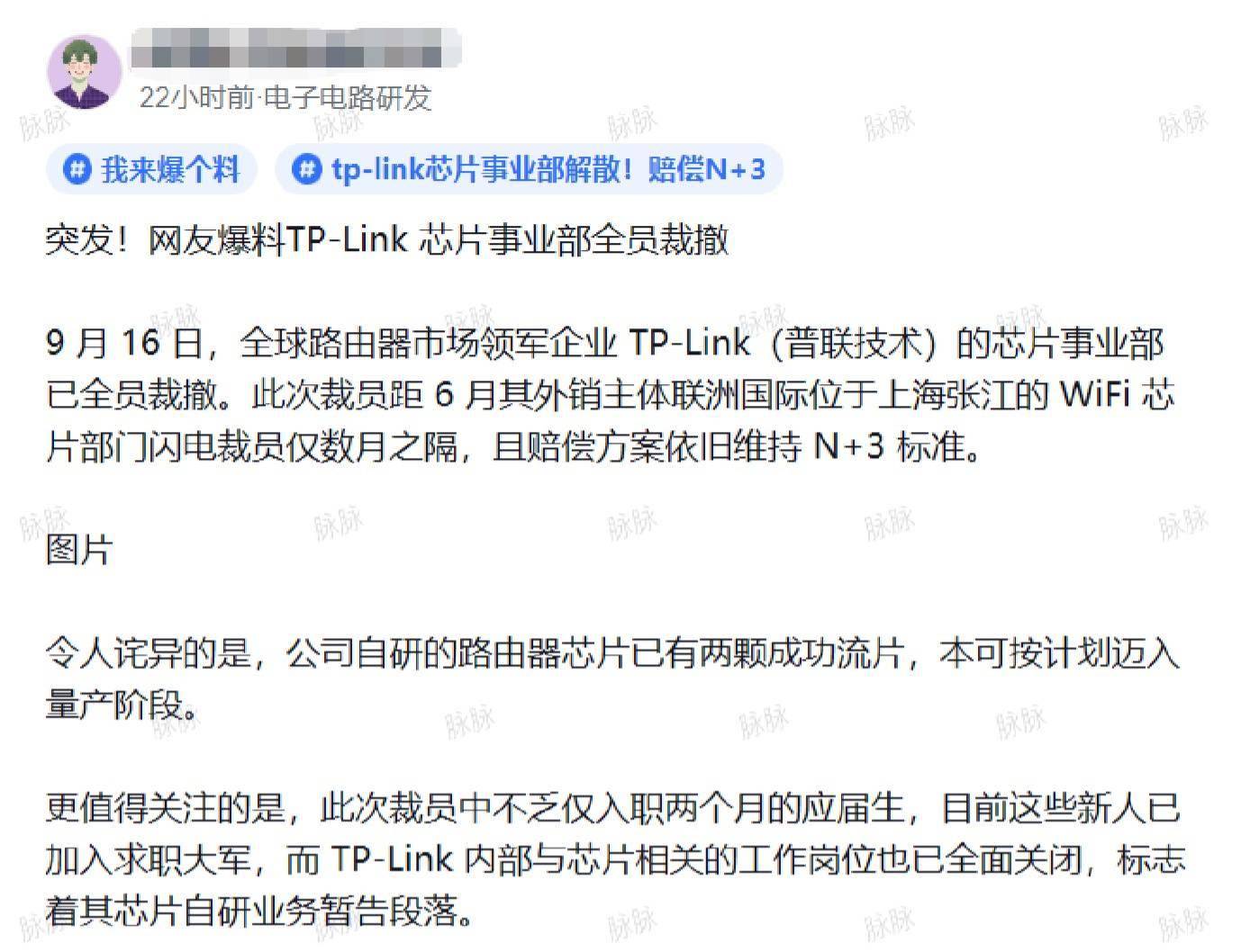 IT之家 9 月 20 日消息,近期有网传消息称,TP-LINK(普联技术)的芯片事业部已全员解散,相应消息称“此次裁员距 6 月其外销主体联洲国际位于上海张江的 Wi-Fi 芯片部门闪电裁员仅数月之隔,且赔偿方案依旧维持 N+3 标准”。