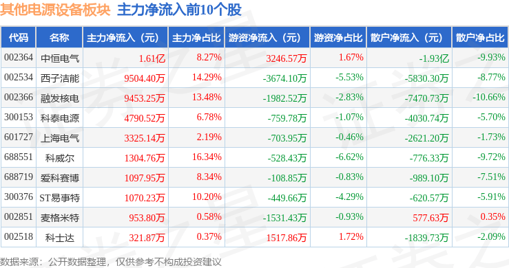 从资金流向上来看,当日其他电源设备板块主力资金净流出1.06亿元,游资资金净流入2954.28万元,散户资金净流入7656.63万元。其他电源设备板块个股资金流向见下表:
