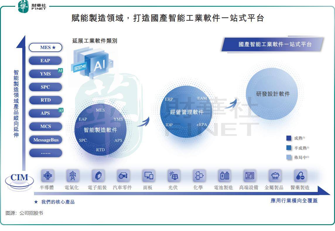 根据招股书,公司成功克服了生态系统封闭所带来的技术壁垒,打造出业内首个且唯一的全栈式智能制造和经营管理软件解决方案。其核心成就在于,实现了对半导体制造全流程的深度集成,成为国内首家且唯一一家全自动CIM(计算机集成制造)解决方案已通过多家12英寸晶圆厂验证并投入量产的供应商。