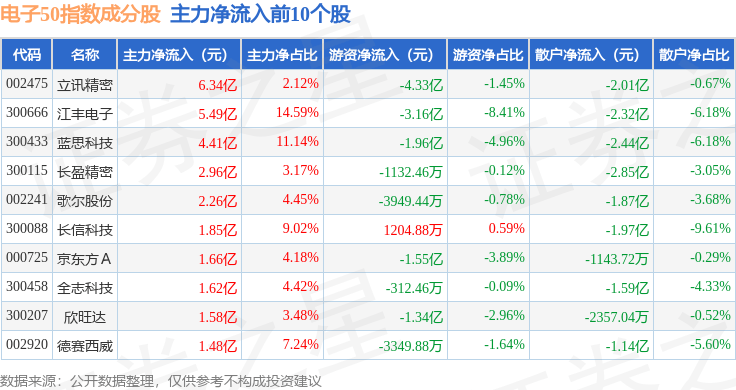 资金流向方面,电子50(399281)指数成份股当日主力资金净流出合计3.44亿元,游资资金净流出合计5.84亿元,散户资金净流入合计9.28亿元。成份股资金流向详情见下表: