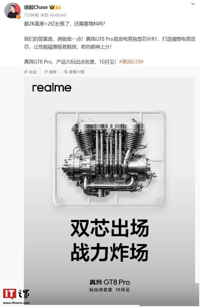 IT之家 9 月 25 日消息,真我 realme 副总裁、全球营销总裁、中国区总裁徐起刚刚发文解答了“都 2K 直屏 + 2 亿长焦了,还需要堆料吗?”这一问题,称答案是再极致一点,真我 GT8 Pro 手机将首发电竞独显芯片 R1,打造强悍电竞双芯。