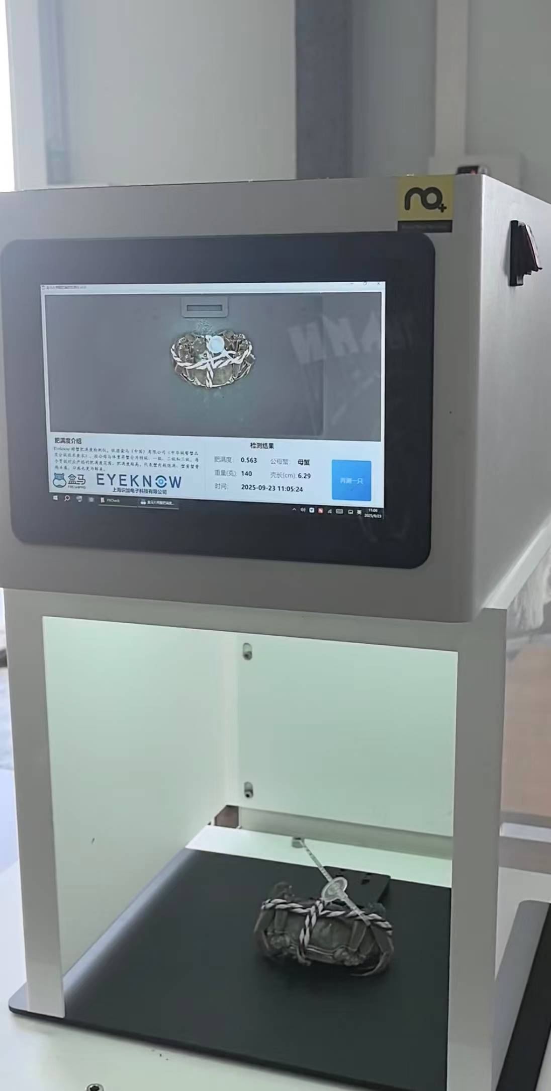 在工厂另一端的桌子上,摆放着一台白色的机箱,这是今年新“上任”的电子验蟹师。记者了解到,作为盒马超市的渠道合作商,董佳贝厂里这台机器,来自盒马超市和上海水产所及上海海洋大学专家合作研发的“电子验蟹师”。可以通过视觉AI技术识别螃蟹的外壳长宽度及重量等参数,计算螃蟹肥满度。现场工作人员把蟹放到机器上,设备会进行“蟹脸识别”,仅需0.8秒就能测出肥满度。记者现场随机检测,两只蟹的肥满度分别为0.647和0.563。