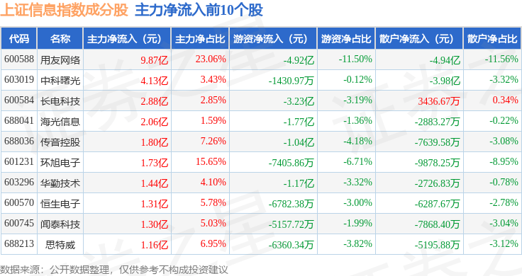 资金流向方面,上证信息(000039)指数成份股当日主力资金净流出合计17.8亿元,游资资金净流入合计8.85亿元,散户资金净流入合计8.95亿元。成份股资金流向详情见下表: