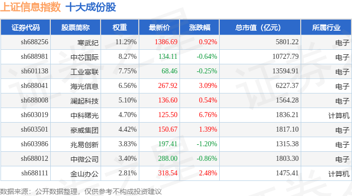 上证信息(000039)指数十大成份股详情如下: