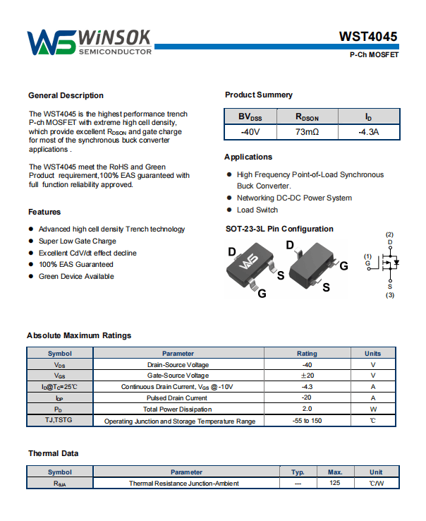 超低导通电阻:73mΩ(VGS=-10V),-3A负载下导通压降仅0.22V,显著降低线束损耗与发热高耐压能力:-40V BVDSS,从容承受24V Jump-Start、-100V Load-Dump等极端瞬态大电流支持:连续-4.3A,脉冲-20A,单颗即可驱动座椅水平/高度/腰托电机,无需并联先进工艺:高密度沟槽技术+超低Qg=14nC,支持200kHz高频开关,适配PWM静音调速可靠性保障:100%EAS测试认证,工作温度-55℃~150℃,满足AEC-Q101参考曲线