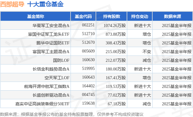 根据2025基金半年报公募基金重仓股数据,重仓该股的公募基金共61家,其中持有数量最多的公募基金为华夏基金的华夏军工安全混合A。华夏军工安全混合A目前规模为44.86亿元,最新净值1.792(9月29日),较上一交易日上涨1.01%,近一年上涨46.41%。该公募基金现任基金经理为万方方。