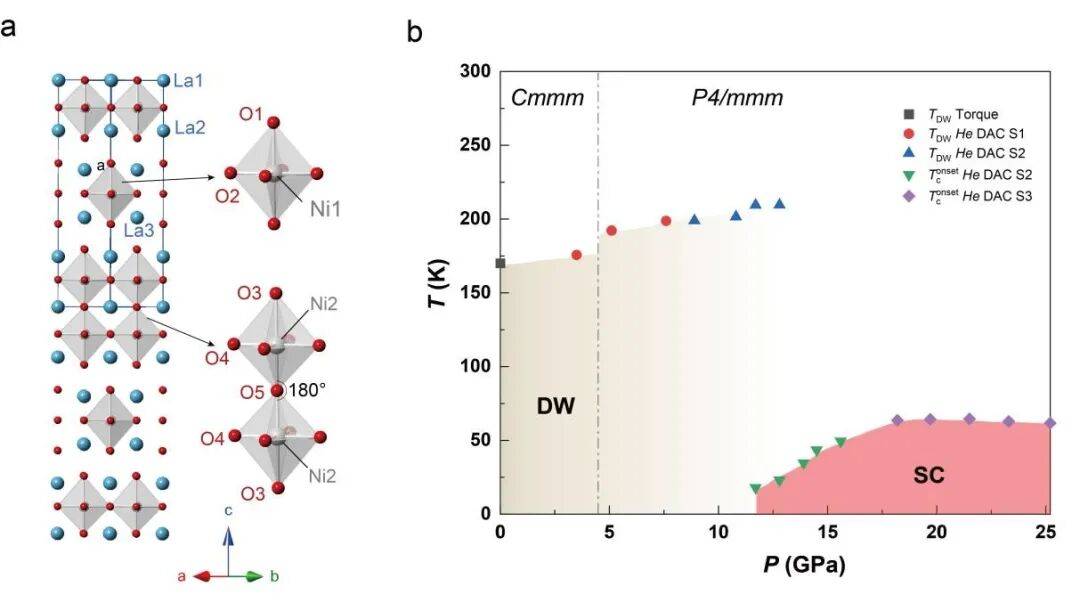 ▲La5Ni3O11的晶体结构(a)和高压相图(b)
