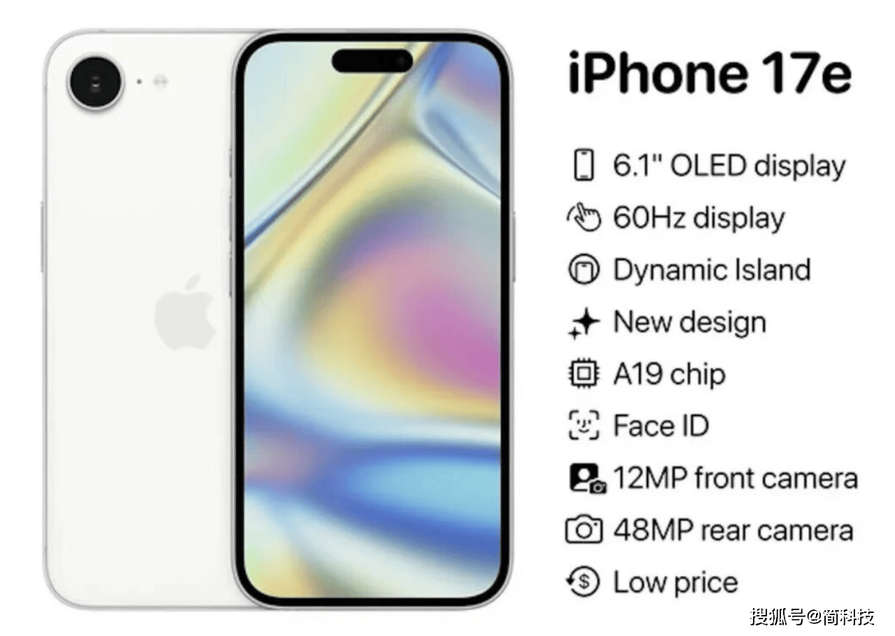 iPhone 17e 配备 6.1 英寸显示屏,灵动岛设计,但依旧是 60Hz 刷新率,后置单摄 4800 万像素,起步存储为 128GB,内存为 8GB,搭载 A19 芯片,铝合金边框+玻璃后盖(或支持 MagSafe),