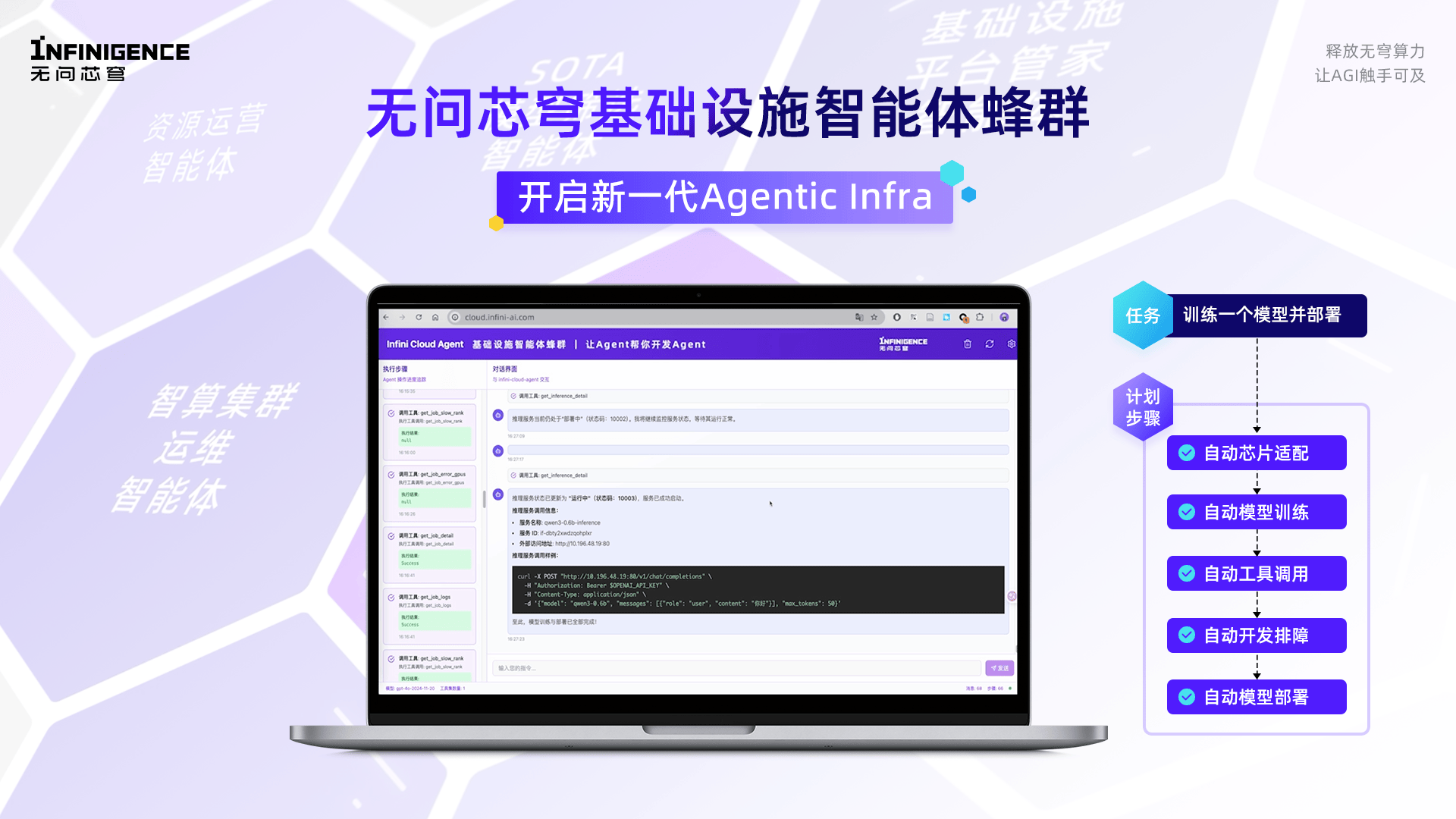 以传统的智算集群基础设施使用运营运维方式为例,无问芯穹基础设施智能体蜂群通过多智能体协同,把传统分散在开发、运维、运营团队的割裂流程,统一在一个智能化的“感知—决策—执行”闭环中。无论是算力池化后的弹性调度、集群跨地域统一运营,还是高性能网络、存储与安全的协同管控,蜂群架构都能实现动态优化与自适应调整。这种整体性能力让算力平台不再只是被动提供资源,而是以自治化的方式主动服务于研发任务和业务目标,实现集群资源利用率、能效比和可靠性的全面提升。